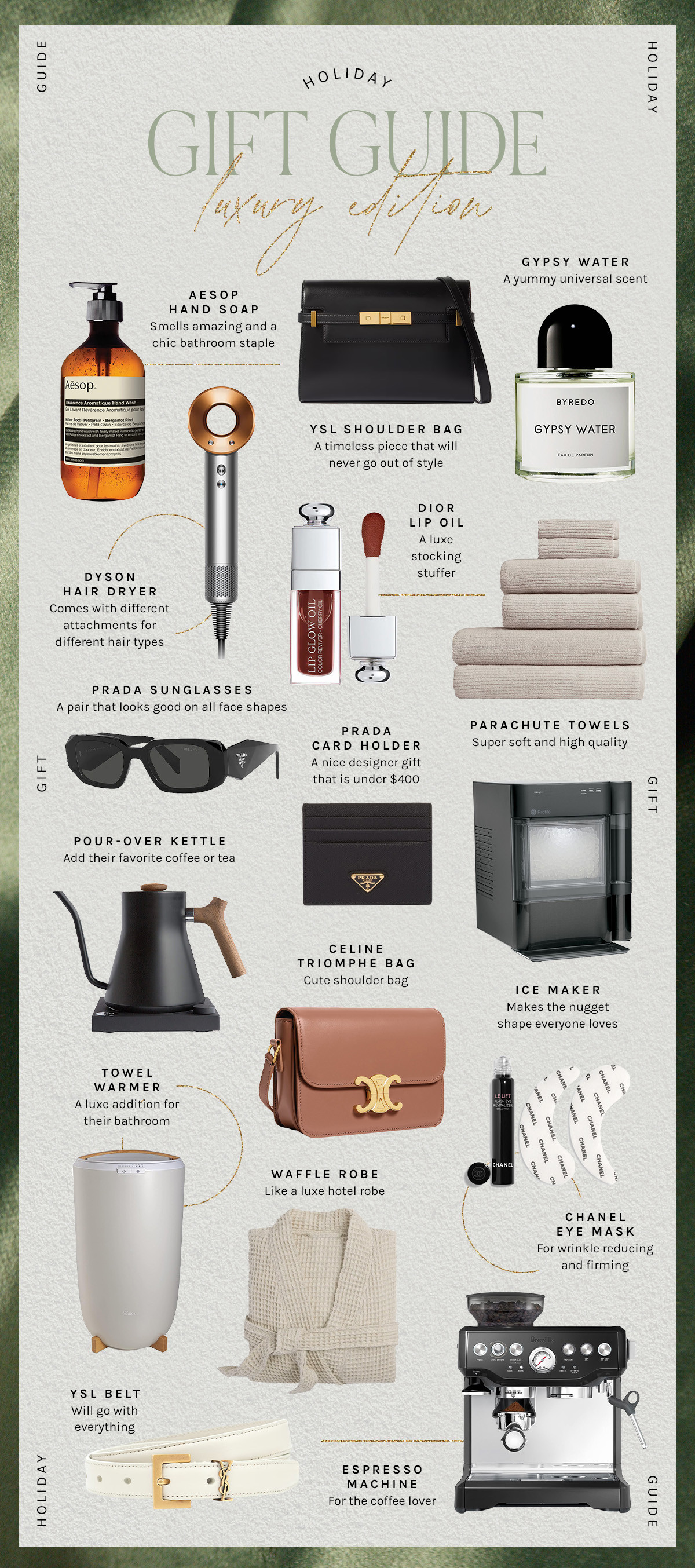 To wrap up my Holiday Gift Guide series this year, we’re talking all things luxury gifts. If you want to splurge this season and gift your family and friends something a little nicer, these gifts are all amazing options. There are some pricier designer options on the list if you really want to spoil them, but this gift guide is filled with a mix of luxury items at all price points. Gift them this Aēsop Aromatique Hand Wash for $41 – still affordable but a luxury soap option to enhance their bathroom or kitchen. Or add this Dior Lip Oil to their stocking for a small luxe gift they’ll love. Luxury isn’t just about two-thousand-dollar bags.